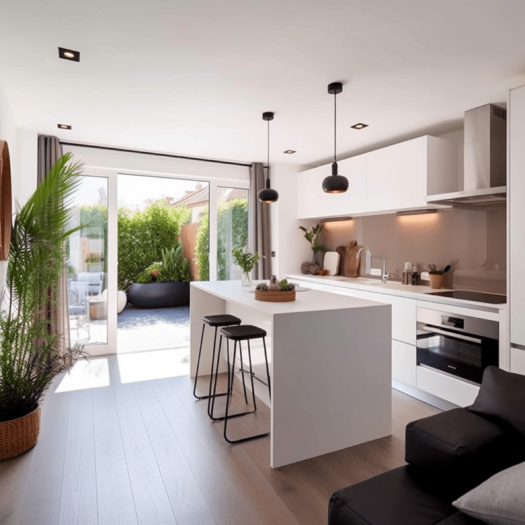 -          Spacieuse pièce de vie avec cuisine ouverte sur séjour et salle à manger (31,37 m²), avec accès direct par de larges baies vitrées à une terrasse de 7,32 m² et un jardin privatif de 27,87 m² ;