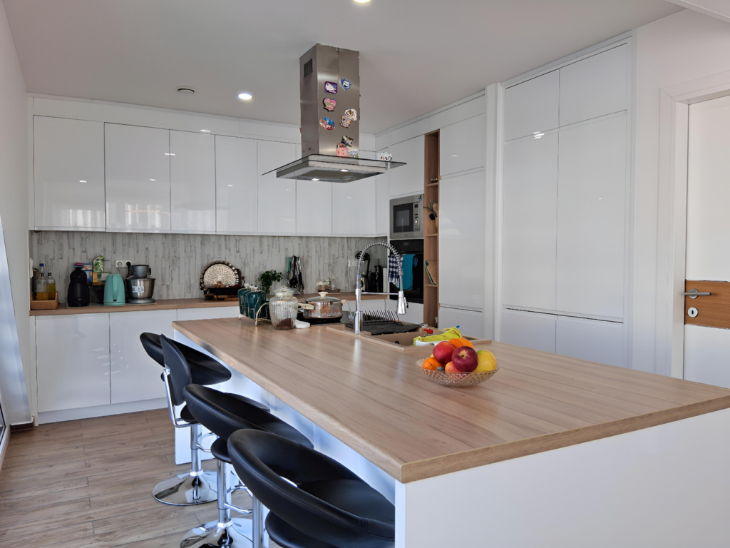 - Cuisine entièrement équipée, dotée d'un îlot central et d'un coin réserve/débarras, ouverte sur une lumineuse salle à manger donnant accès à la première terrasse,
