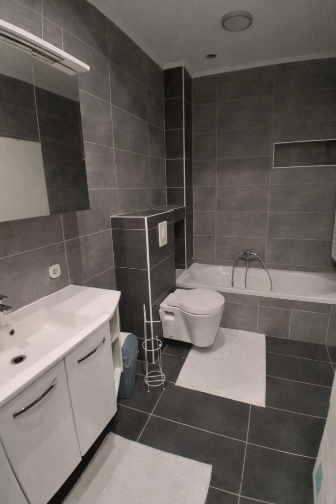 -          Salle de bains complète (baignoire, douche, WC, lavabo, branchement machine à laver).